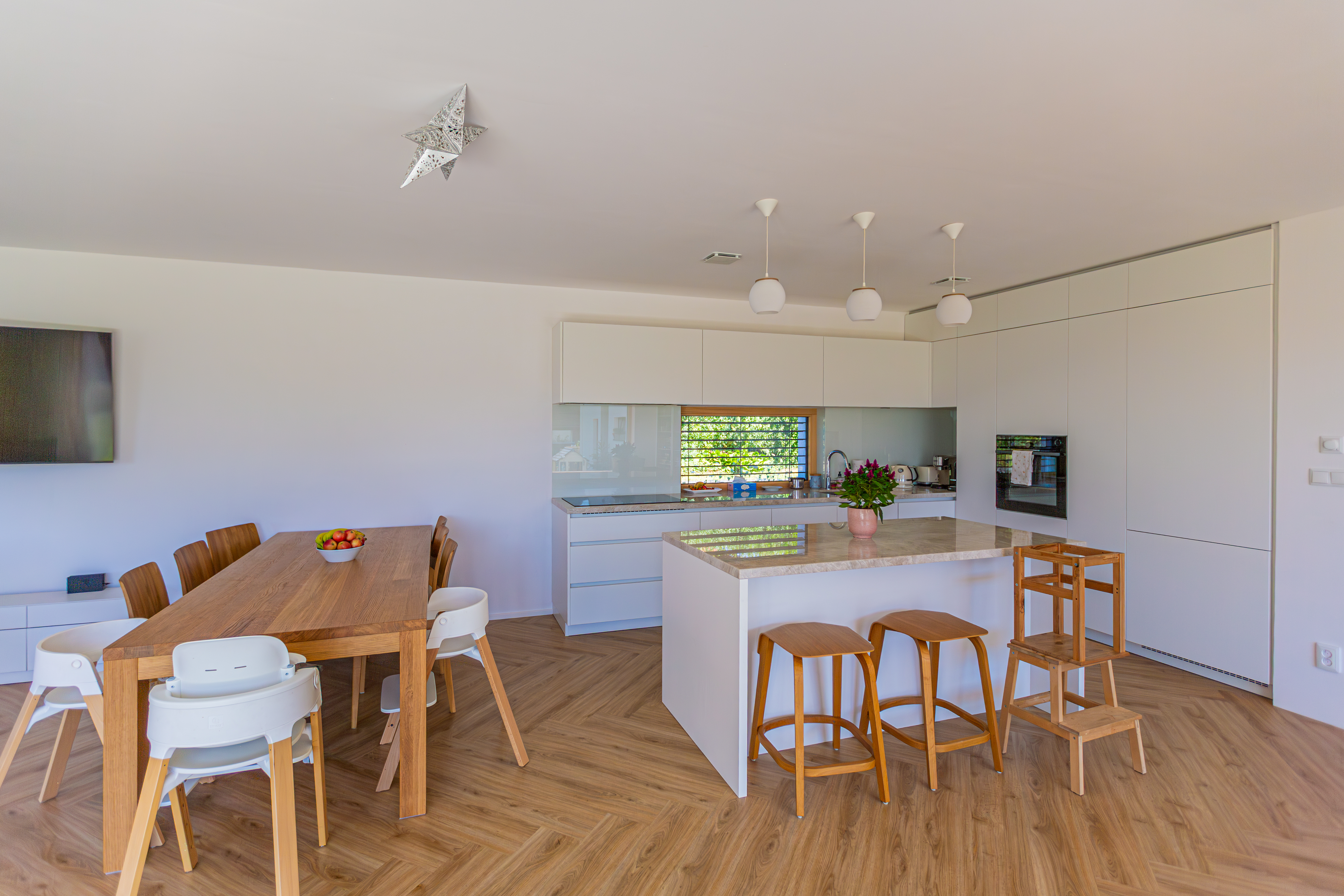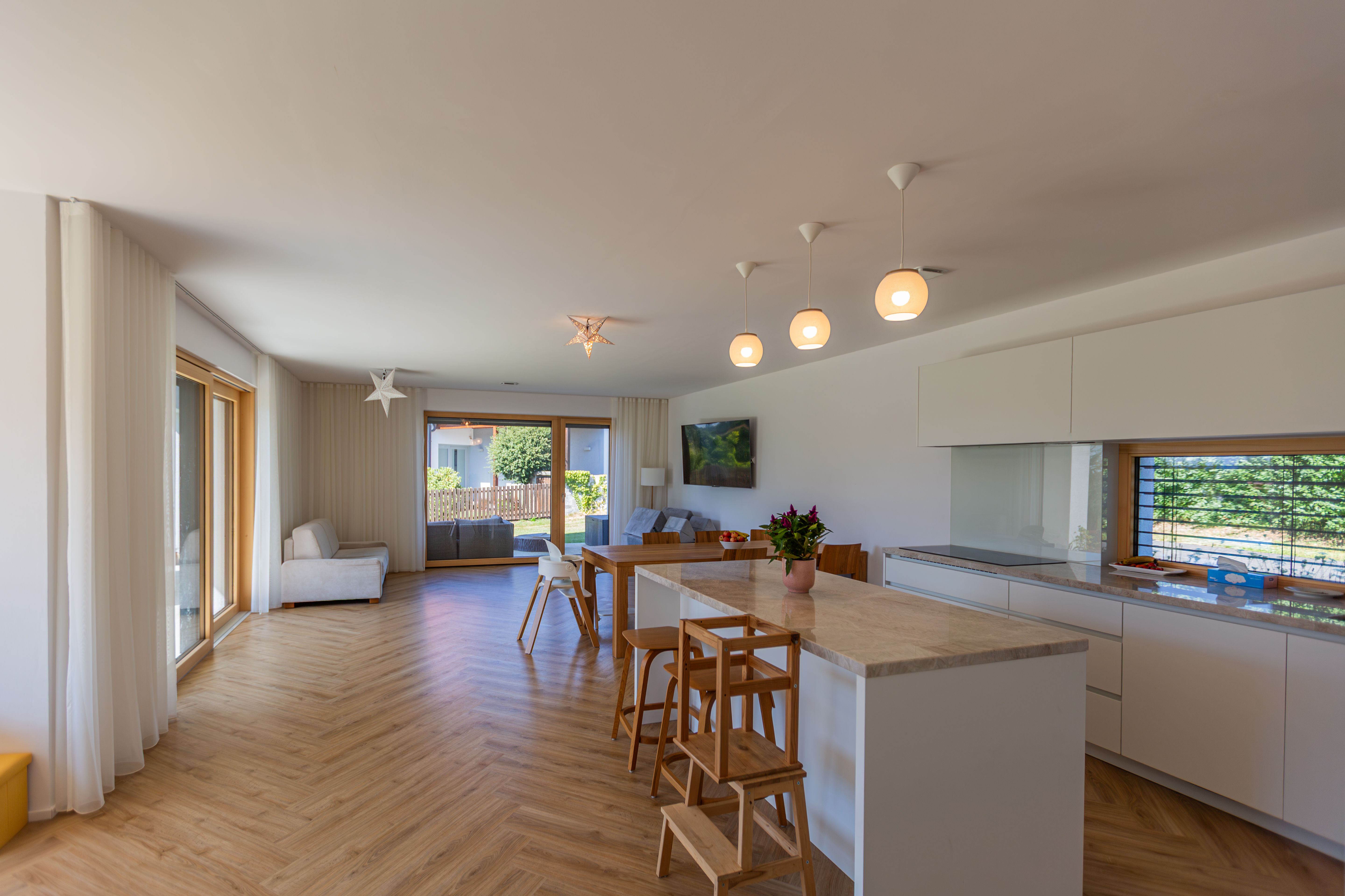 V přízemí je hlavní obytný prostor s kuchyní a jídelnou, potom pracovna, koupelna a technická místnost. V podkroví ložnice s šatnou a koupelnou, tři dětské pokoje a druhá koupelna. A v jednom z dětských pokojů jsme nechali udělat přípravu na vodu, aby se třeba za pár let dal proměnit na kuchyň a patro mohlo fungovat jako samostatná bytová jednotka. Nechci to přivolávat, ale s ohledem na stále rostoucí ceny nemovitostí a nedostatek pozemků možná naše děti nebudou mít takovou možnost, jako jsme měli my, takže jsme od začátku chtěli zajistit možnost dvougeneračního bydlení.