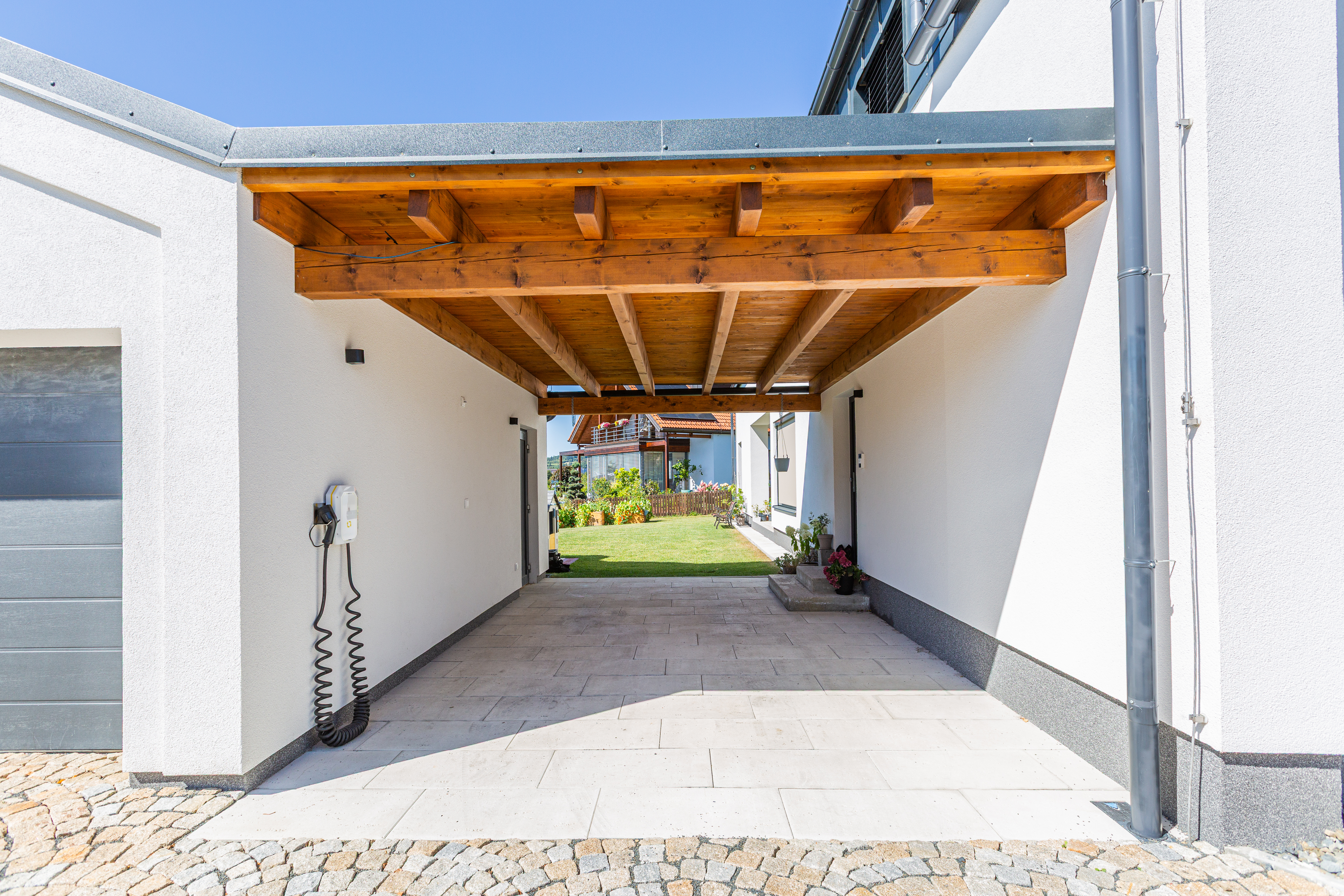 Moji ženu. Všechno hezké je dílem mé ženy. Konstrukčně je přesah řešený vyzděním zdí a klasickým krovem, povrch je komplet řešený omítkou. Uvažovalo se o dřevěném podbití, ale říkal jsem ženě, že ho natírat nebudu (smích).