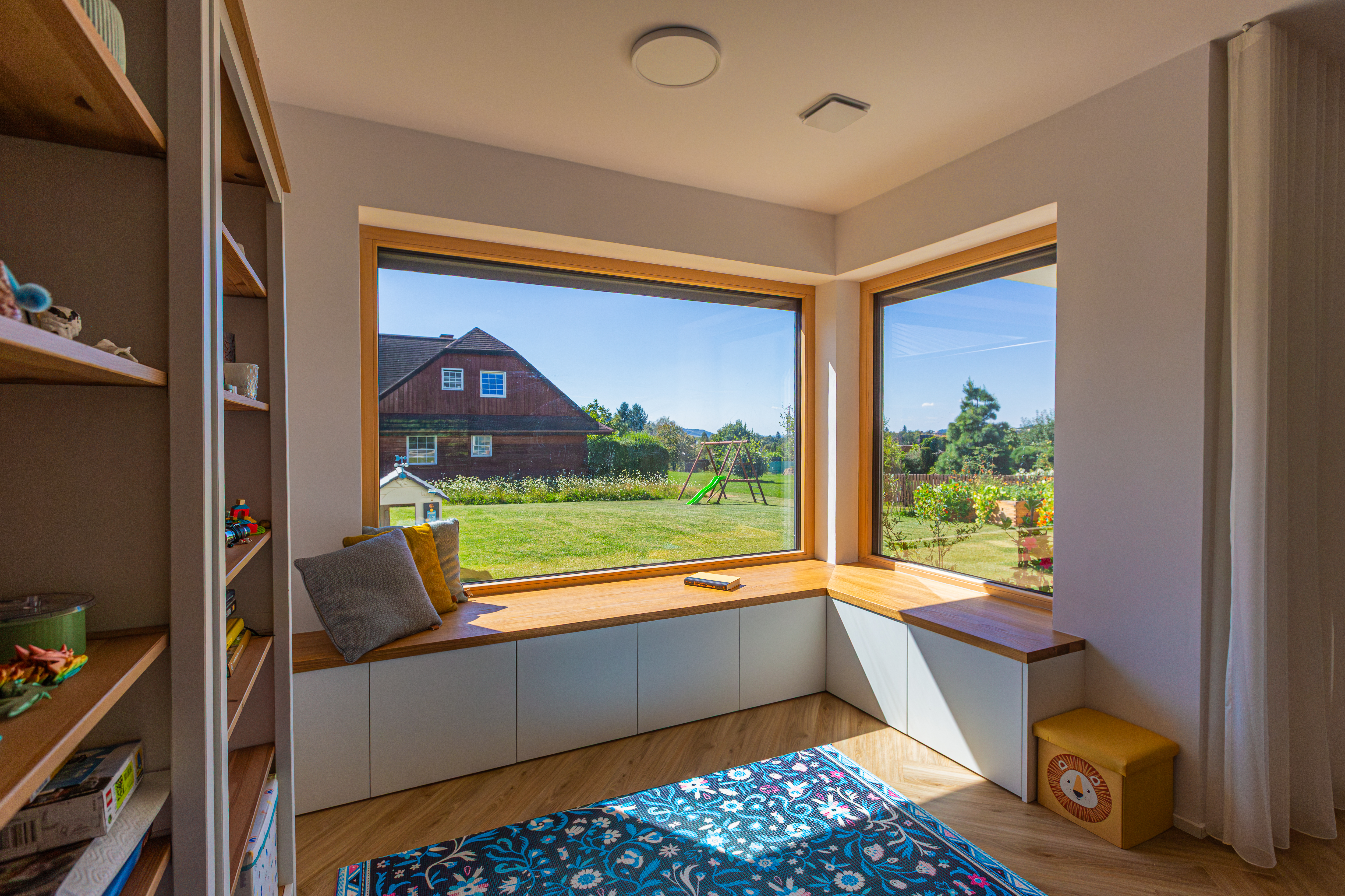 Moje žena chtěla rohové okno, což z nějakých konstrukčních důvodů úplně neklaplo, ale máme alespoň prosklené rohové sezení u okna. A já chtěl dílnu.