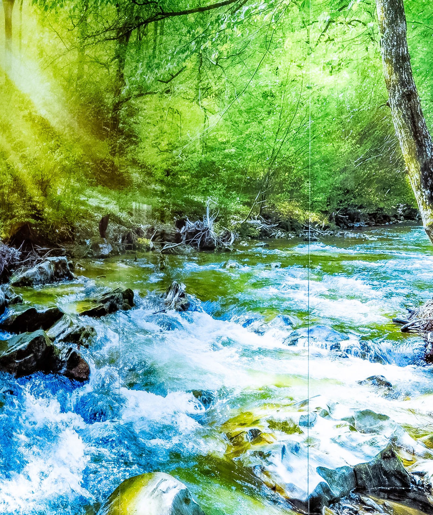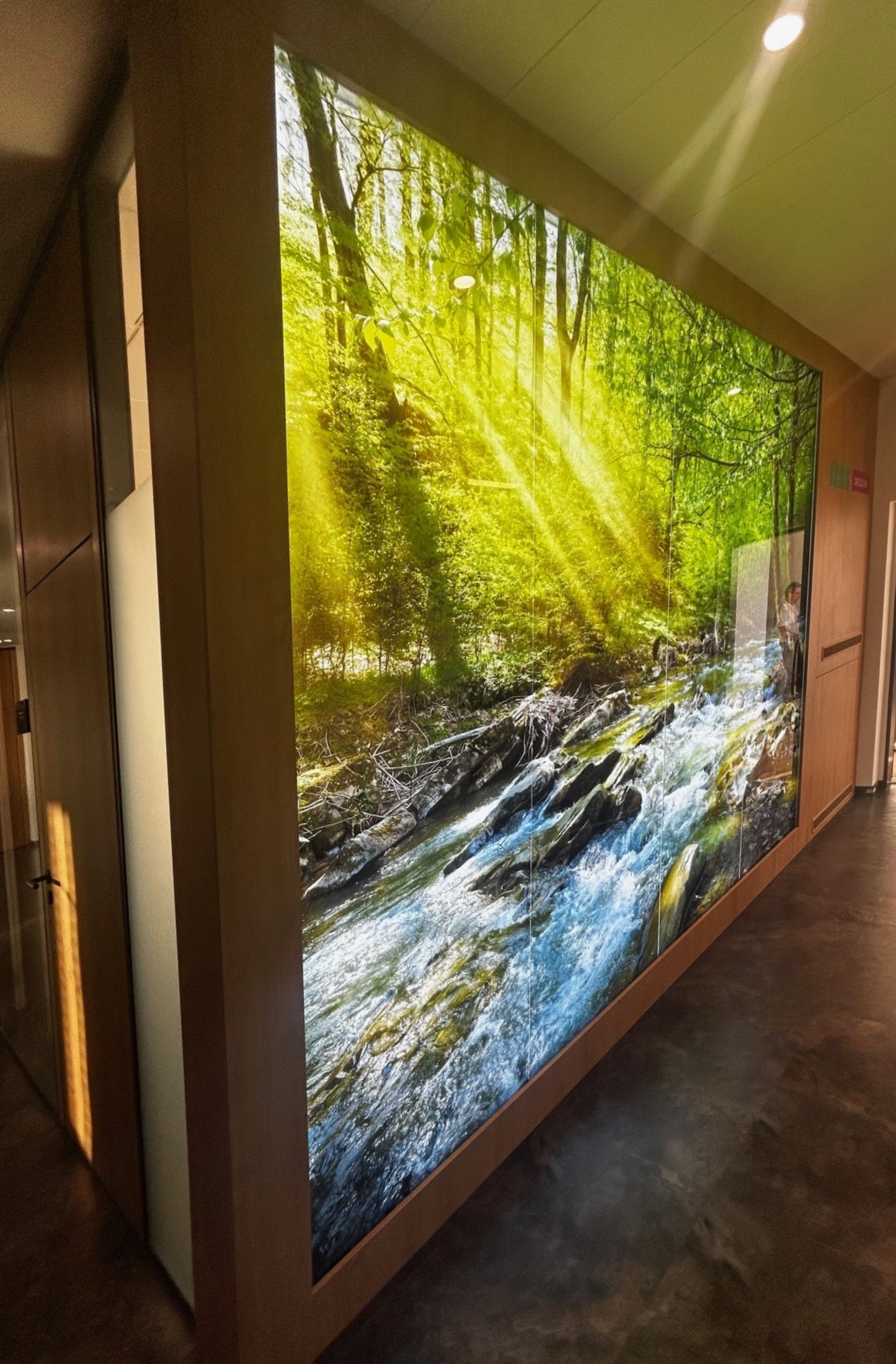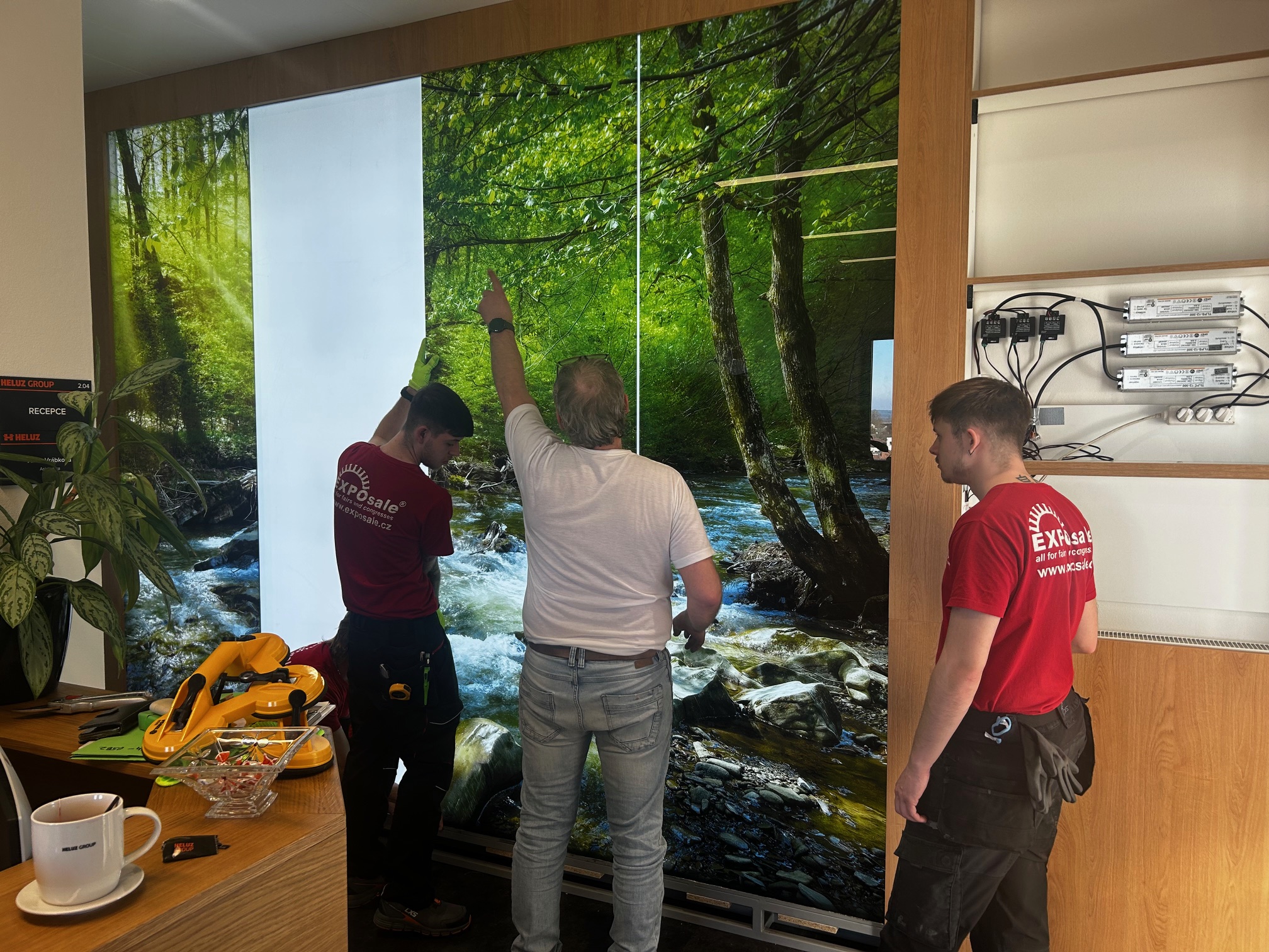 Dekor stěny vychází z fotografie české přírody, která byla upravena pomocí umělé inteligence (AI) tak, aby dosahovala maximální kvality i při velkoformátovém tisku. Pro dosažení dlouhodobé kvality je fotografie natištěna na sklo pomocí digitální tiskárny keramickými barvami, které jsou následně zakaleny přímo do skla. Tato technologie zajišťuje odolnost tisku proti poškrábání, vyblednutí i chemikáliím používaným při běžném čištění. Výsledkem je design, který je nejen esteticky přitažlivý, ale také extrémně trvanlivý.