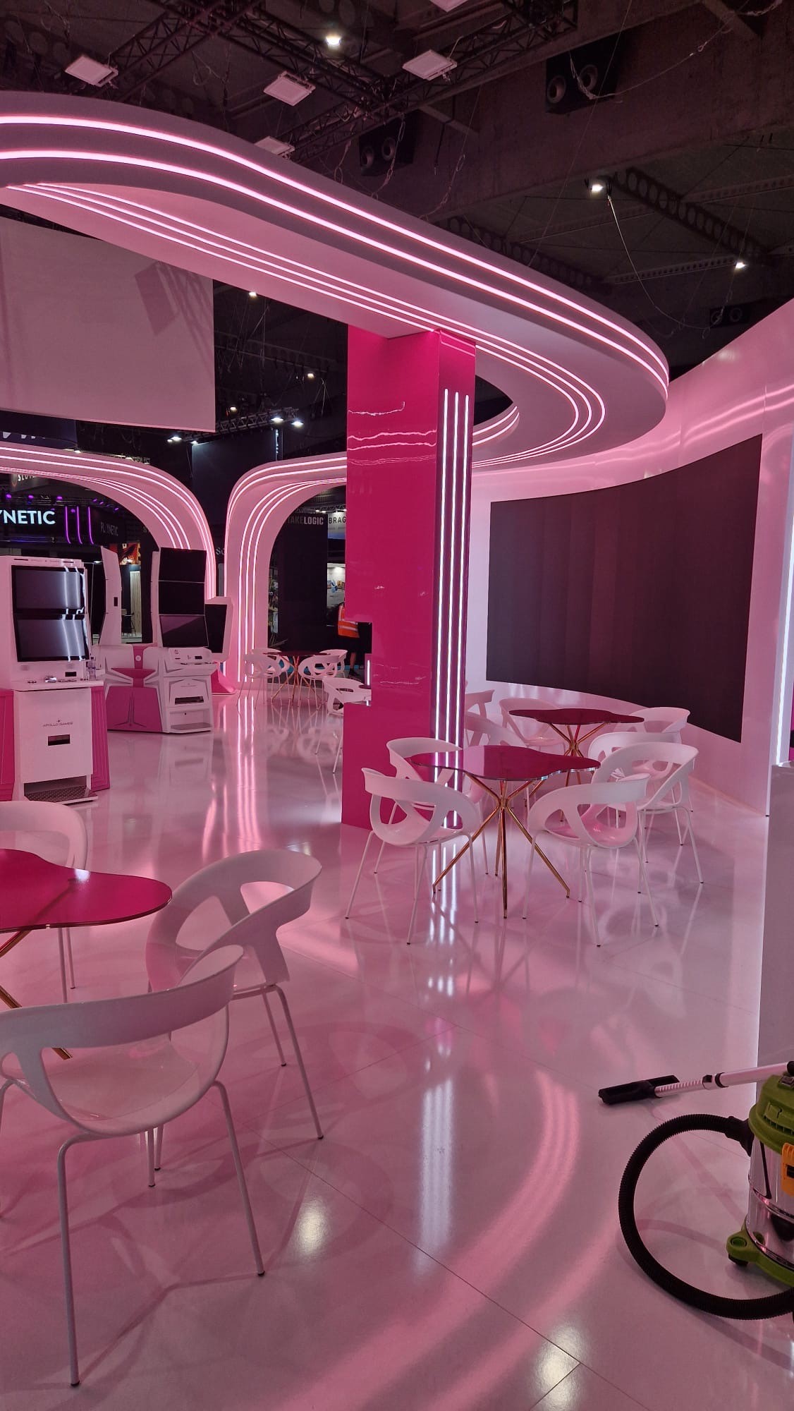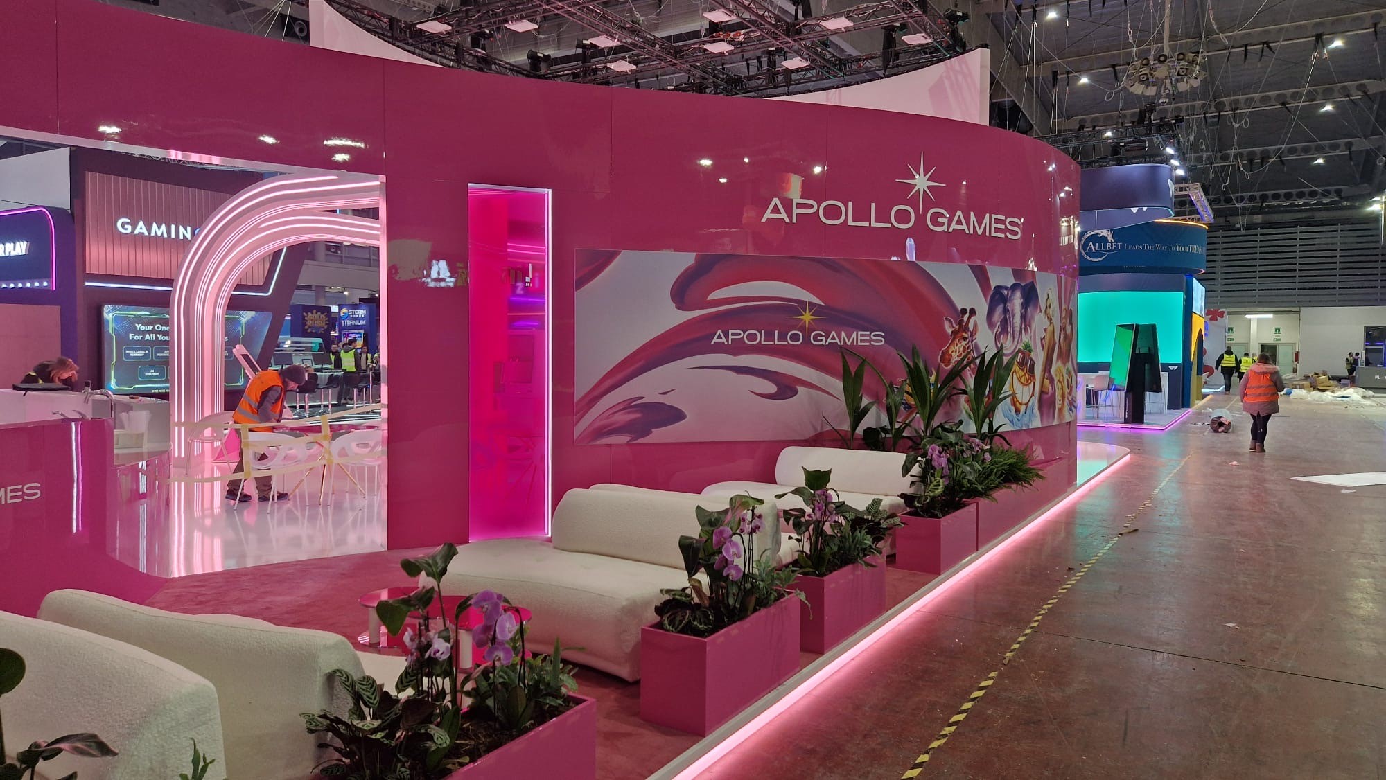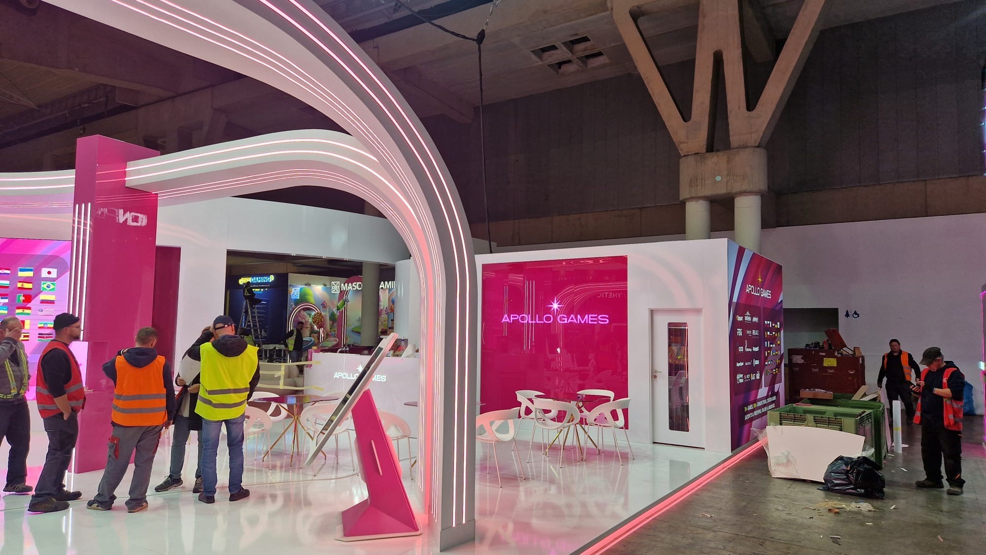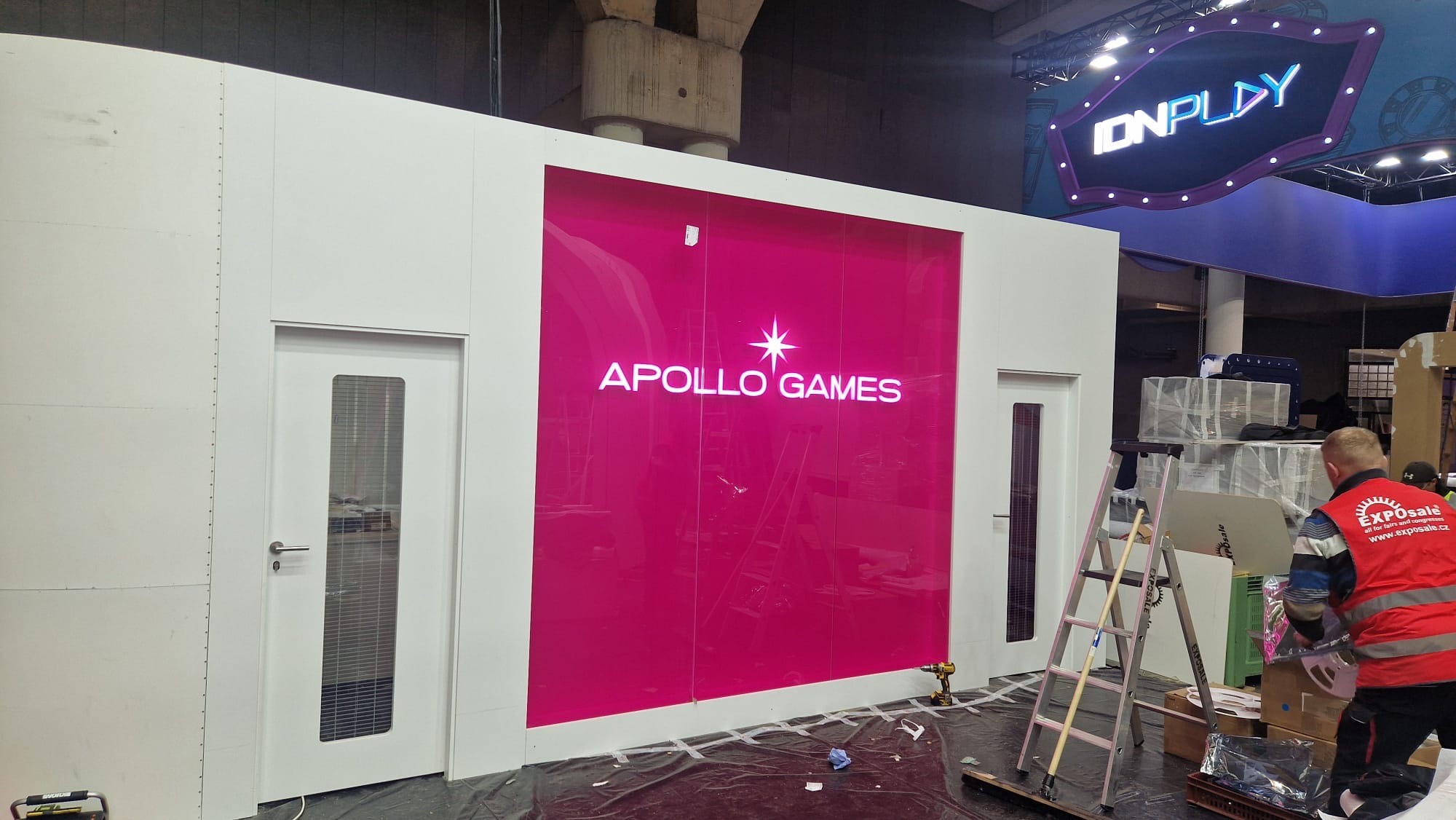 Pro expozici byla realizována skleněná stěna o rozměru 2,7 x 2,68 metru, polepená růžovou fólií. Na stěně bylo umístěno trojrozměrné logo společnosti APOLLO GAMES, které poutalo pozornost návštěvníků a zároveň jasně prezentovalo identitu značky. Součástí expozice bylo rovněž okno o velikosti 0,7 x 2,99 m pro oddělení dvou částí prostoru se zachováním průhlednosti.