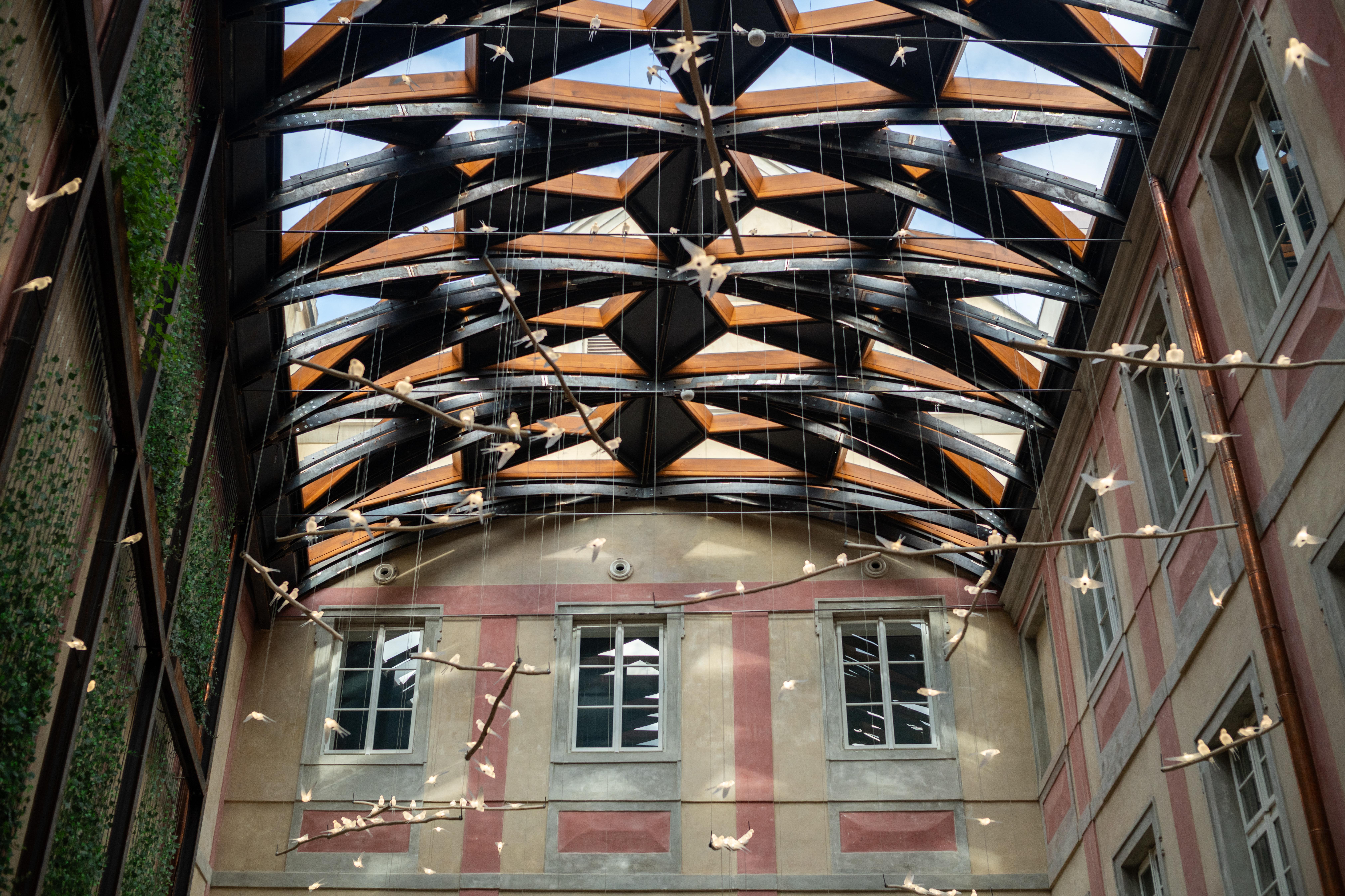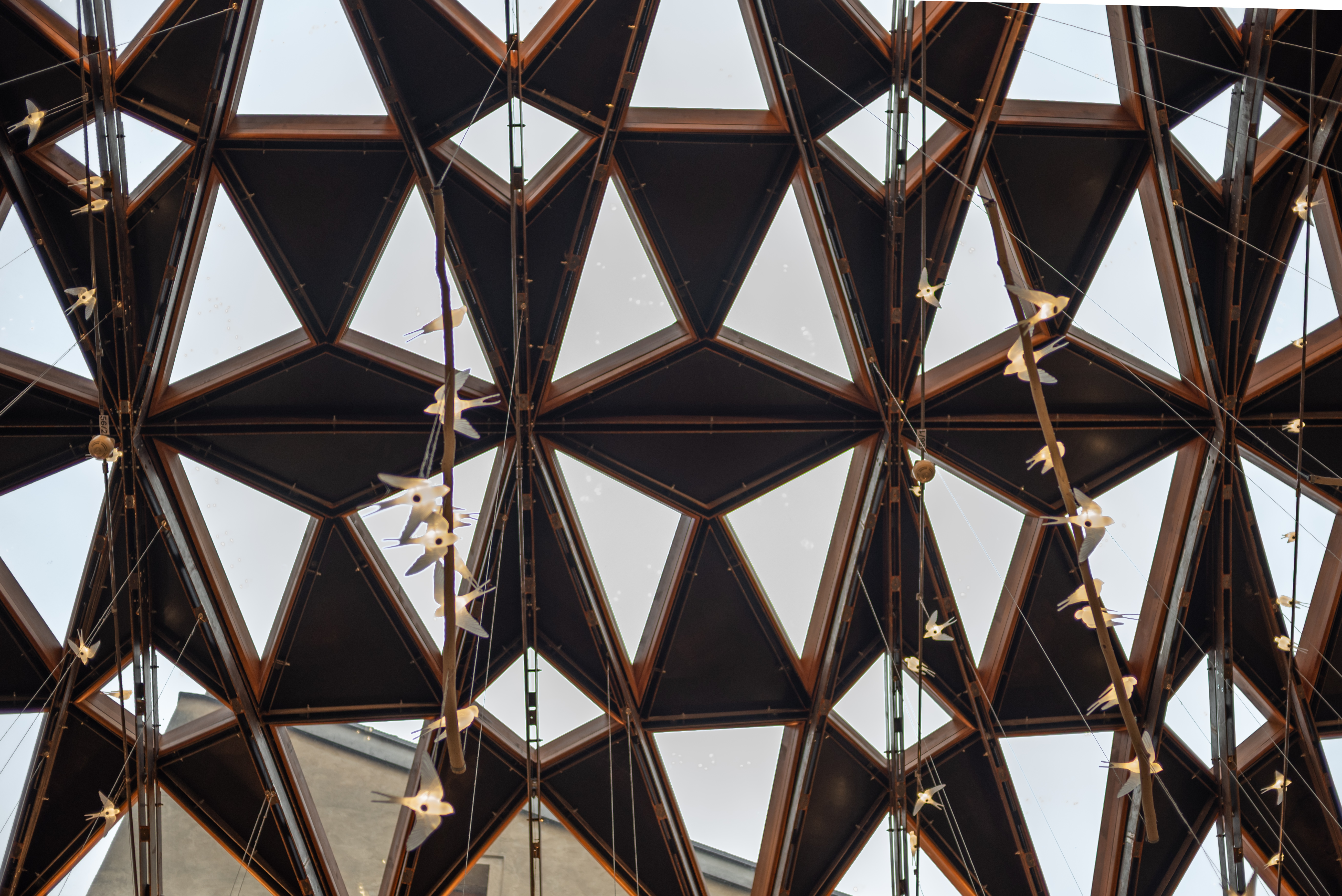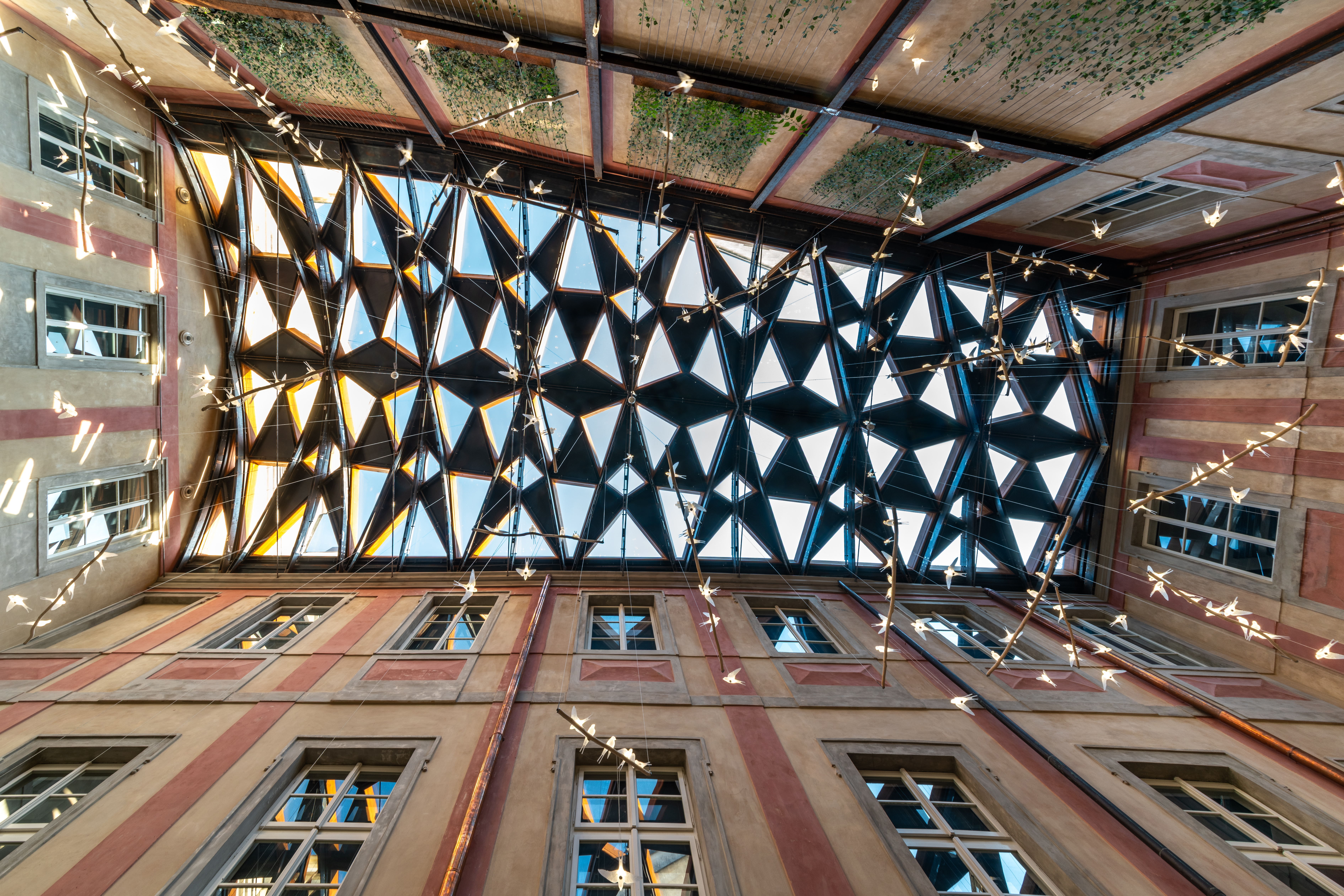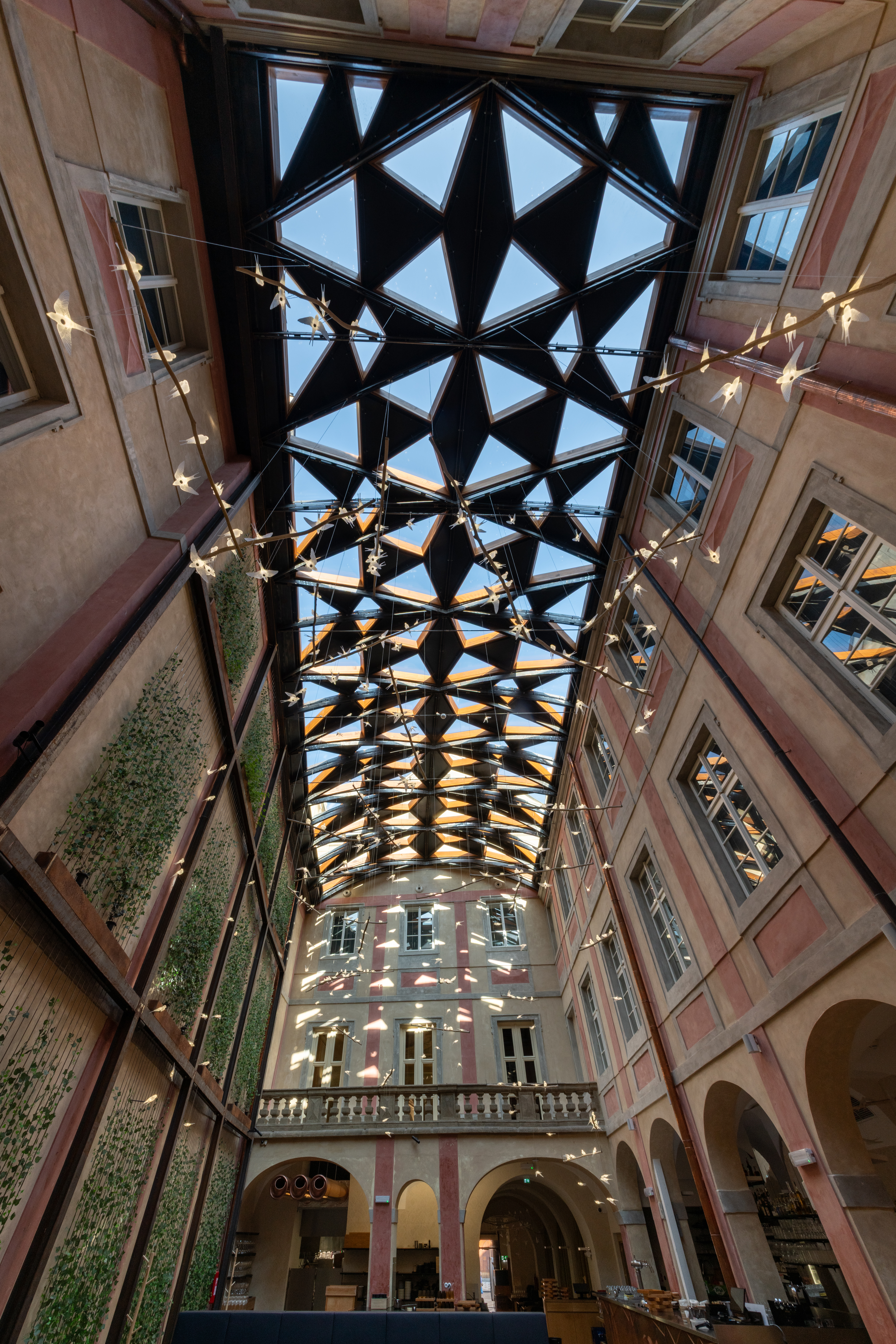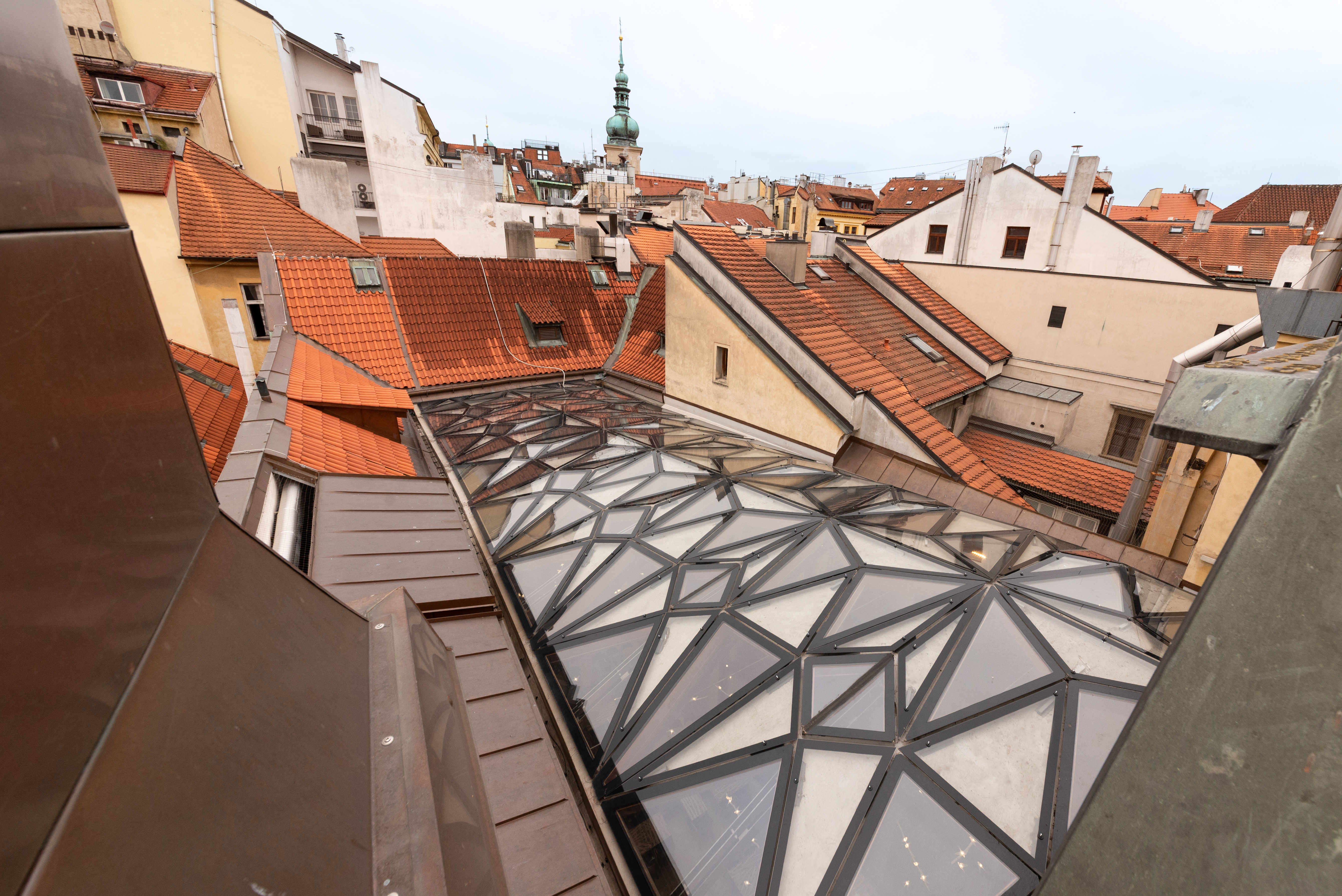 Protože samotná nosná konstrukce představuje poměrně velké procento neprůhledné plochy, bylo nutné pro prosklené části použít co nejtransparentnější skla. „Bronzové nebo šedé varianty zasklení, které se v případě střešní aplikace běžně používají, by prostor příliš ztmavily,“ vysvětluje Martin Najman. Zvolená izolační dvojskla mají světelnou propustnost přibližně 80 %, solární faktor přes 60 % a součinitel prostupu tepla U = 1,1 W/m²K. Vnější skla jsou tepelně tvrzená a díky tomu velmi mechanicky odolná, například i proti krupobití. Vnitřní sklo je kvůli bezpečnosti návštěvníků lepené, s bezpečnostní fólií. Kdyby totiž přeci jen došlo k destrukci zasklení, ulpí střepy na bezpečnostní fólii a nepropadnou do dvora.