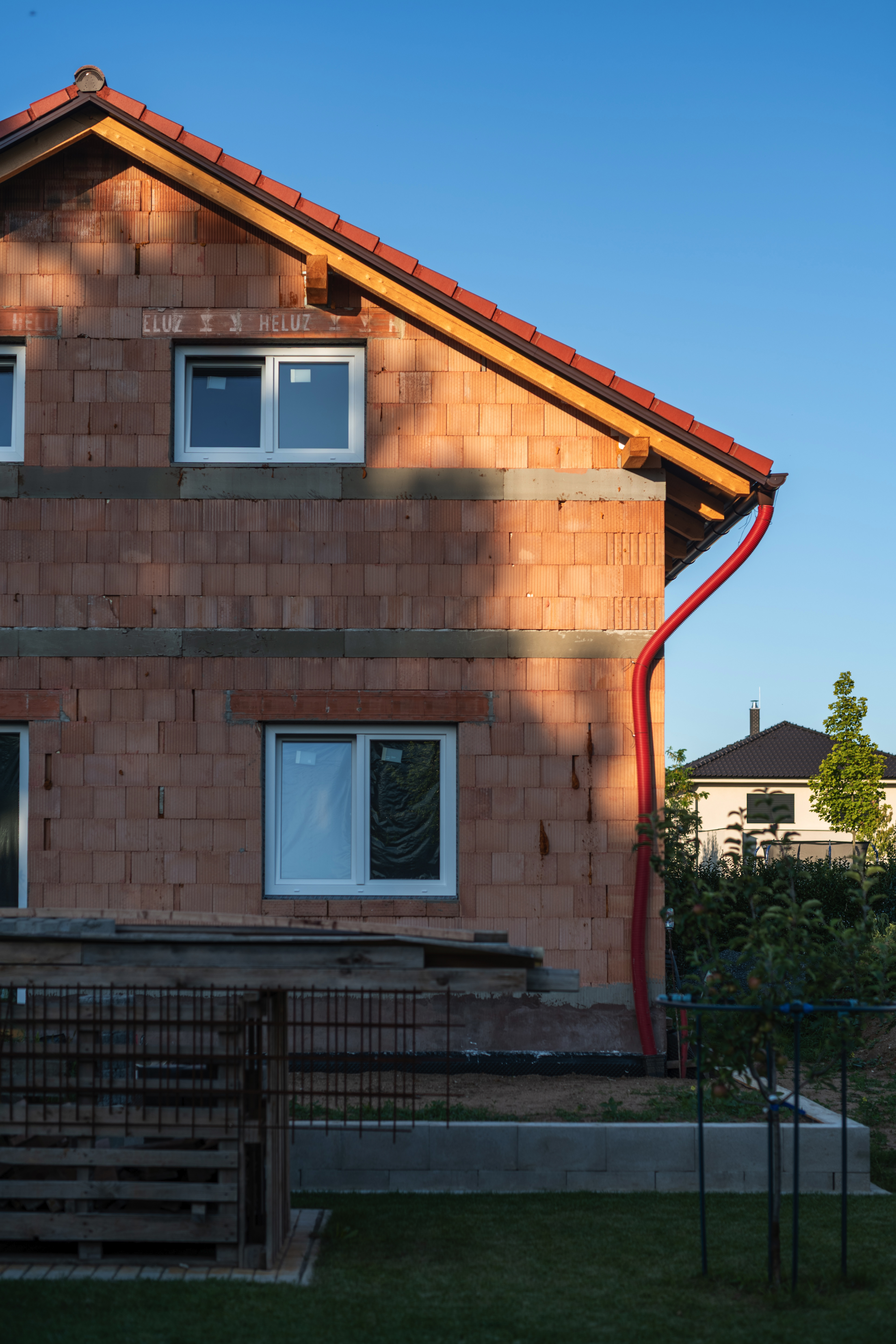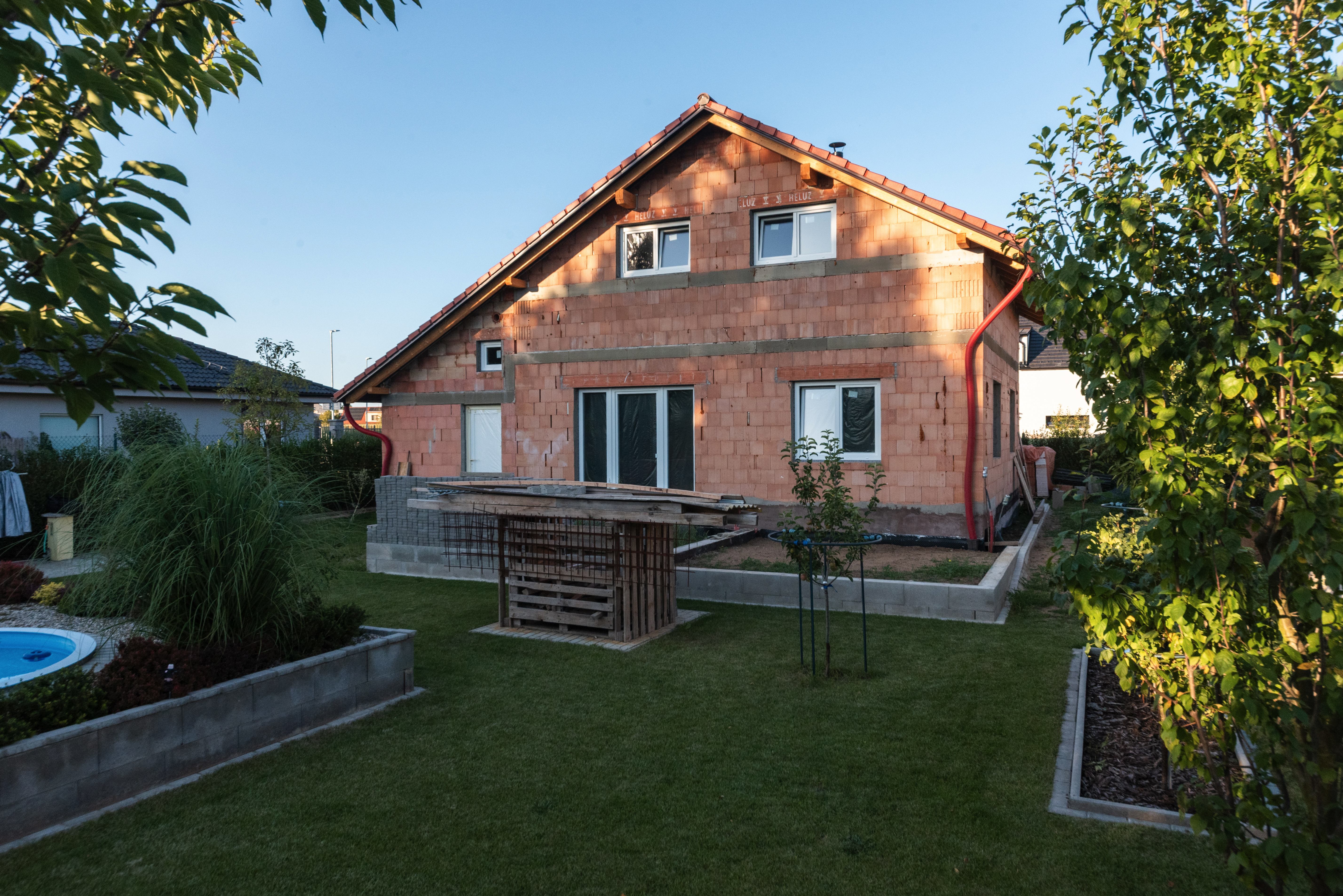 do budoucna tři ložnice a koupelna. Podkrovní místnosti mají relativně malá okna, ale to byl promyšlený záměr – nedochází tak k nežádoucímu přehřívání ložnic v letních měsících a nebylo nutné řešit předokenní stínění. Jak probíhala samotná výstavba? Majitel asi rok realizoval základovou desku, a to včetně inženýrských sítí. Pouze lití betonu a hutnění nechal realizovat firmou, stejně tak založení prvního šáru zdiva v přízemí i podkroví. Dále se zděním pokračoval svépomocí. Společně s kamarádem instalovali v rozích do rohů jekly se zavětrováním, které pomáhaly s dodržením svislosti, odměření všech svislých částí stavebních otvoru a vodorovné vedení zednické šňůry. Následně se mohl pustit do vyzdívání dalších šárů zdiva, které jsou dokonale vodorovné. Na otázku, jak dokázal rovinnost zachovat, odpovídá, že mu stačilo vyrovnání první řady, kterého se posléze při dalším zdění „držel“. „Opravdu to jde - vyzdít zdivo do tří metrů bez podkládání nebo znovuzaložení,“ říká stavebník.
