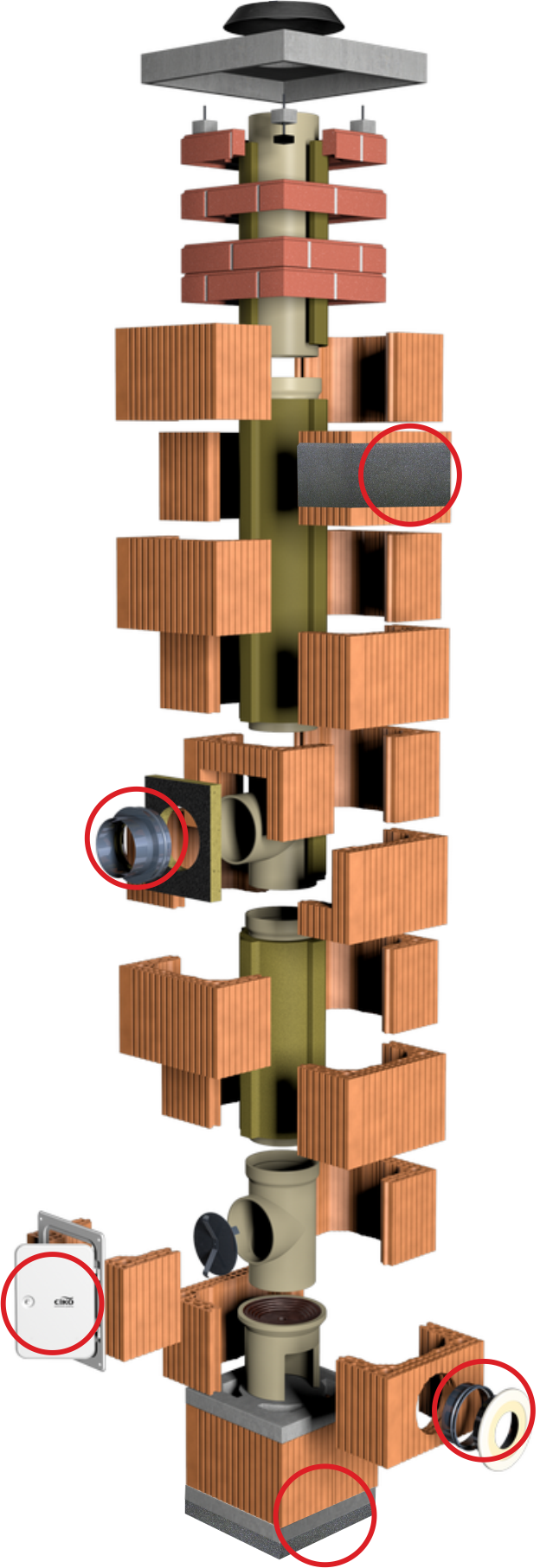 V rámci přípravy komína monoTEC jsou volitelným parametrem těsná komínová dvířka, těsná redukce pro napojení spotřebiče, bezpečný prostup CIKO STOPER v parotěsném nebo minerálním provedení a také přerušení tepelného mostu v základové spáře.