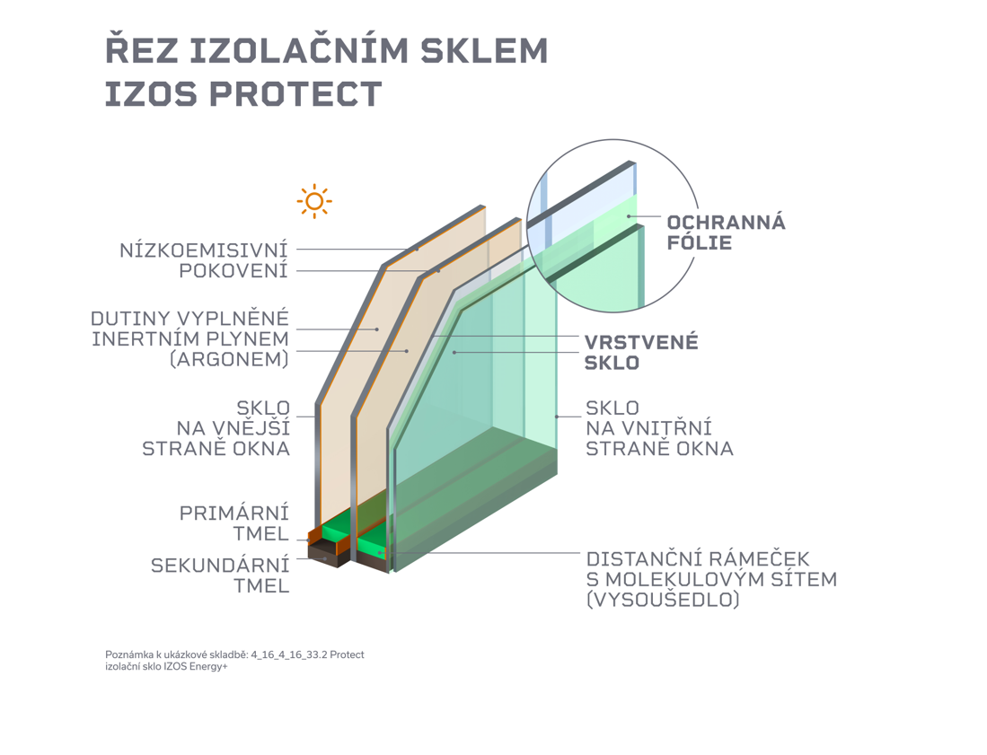 Zatímco součinitel prostupu tepla zasklením Ug může u dvacet let starých oken s dvojskly činit více než 3,5 W/m2K, izolační trojskla IZOS dosahují až 7x lepších tepelněizolačních schopností (0,5 W/m2K.) „Tyto parametry jsou dokonce 2x lepší už u moderních dvojskel IZOS, které mívají hodnotu součinitele prostoru tepla kolem 1,0 W/m2K,“ upozorňuje Petr Zachara. Díky těmto vlastnostem mohou skla rosické škole uspořit za vytápění i desítky procent. Zajímavostí je, že skla IZOS Energy+ také omezují pronikání škodlivého UV záření na 29 %. Tato vlastnost je u zasklení mnohdy přehlížena, může však mít zásadní vliv na zdraví a pohodlí, stejně jako na stálost barev a životnost vybavení interiérů, včetně nábytku a podlah. Další výhodou kvalitních skel je výborná izolace hluku.