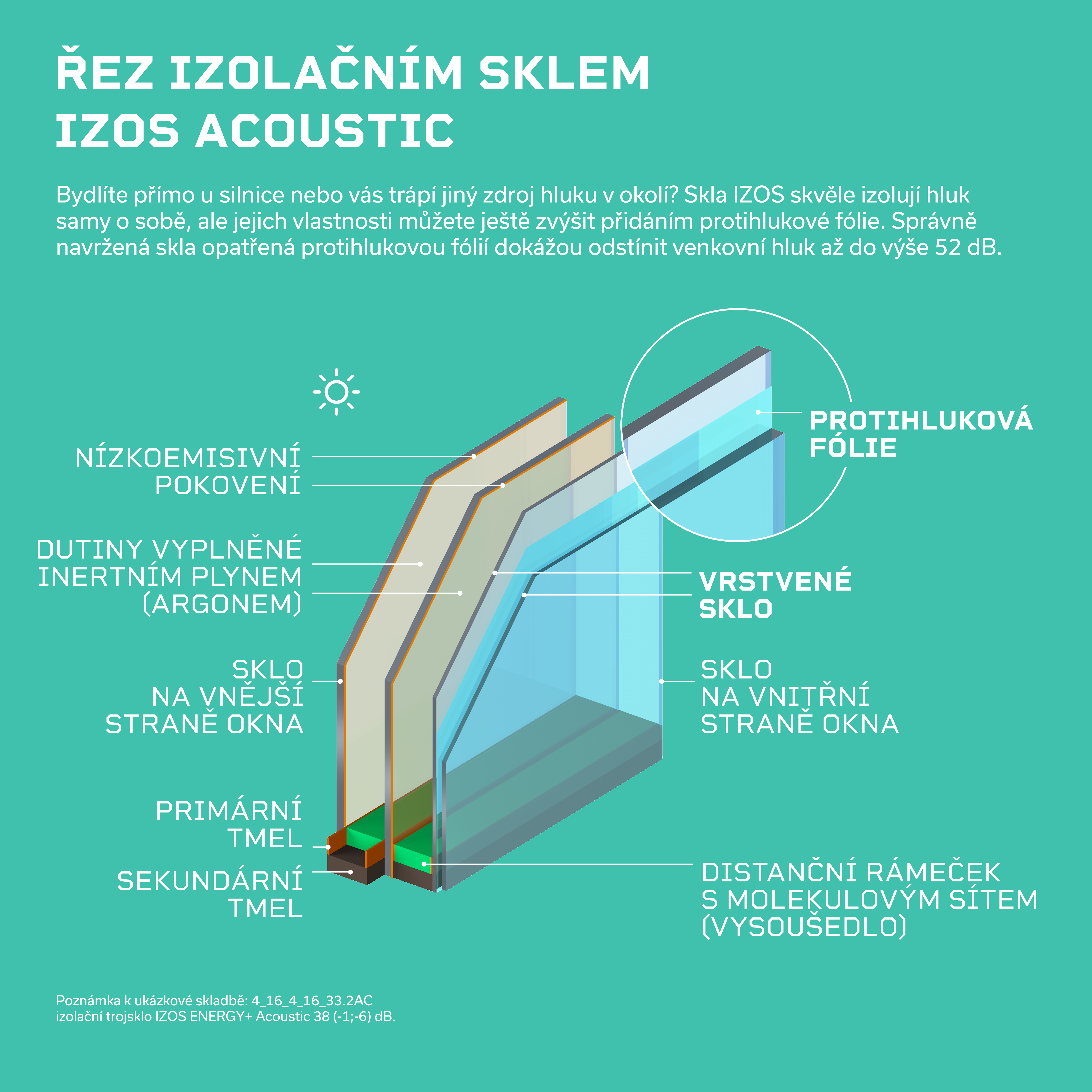 Tato data umožňují navrhovat zasklení podle skutečné hlukové zátěže lokality, nikoli podle univerzálních předpokladů. Například trojsklo IZOS Shadow Acoustic s konfigurací 8–4–4 mm dosahuje neprůzvučnosti 40 dB při součiniteli prostupu tepla Ug = 0,5 W/m²K. Varianta IZOS Shadow Protect Acoustic s tabulemi 8–6–VSG 44.2 pak nabízí až 45 dB, což je o několik decibelů více než běžná konkurenční řešení. A v portfoliu jsou i skla, která dokážou odstínit až 52 dB – tedy hodnoty, které umožňují udržet interiér v pásmu doporučeném pro spánek i v místech s vysokou dopravní zátěží.