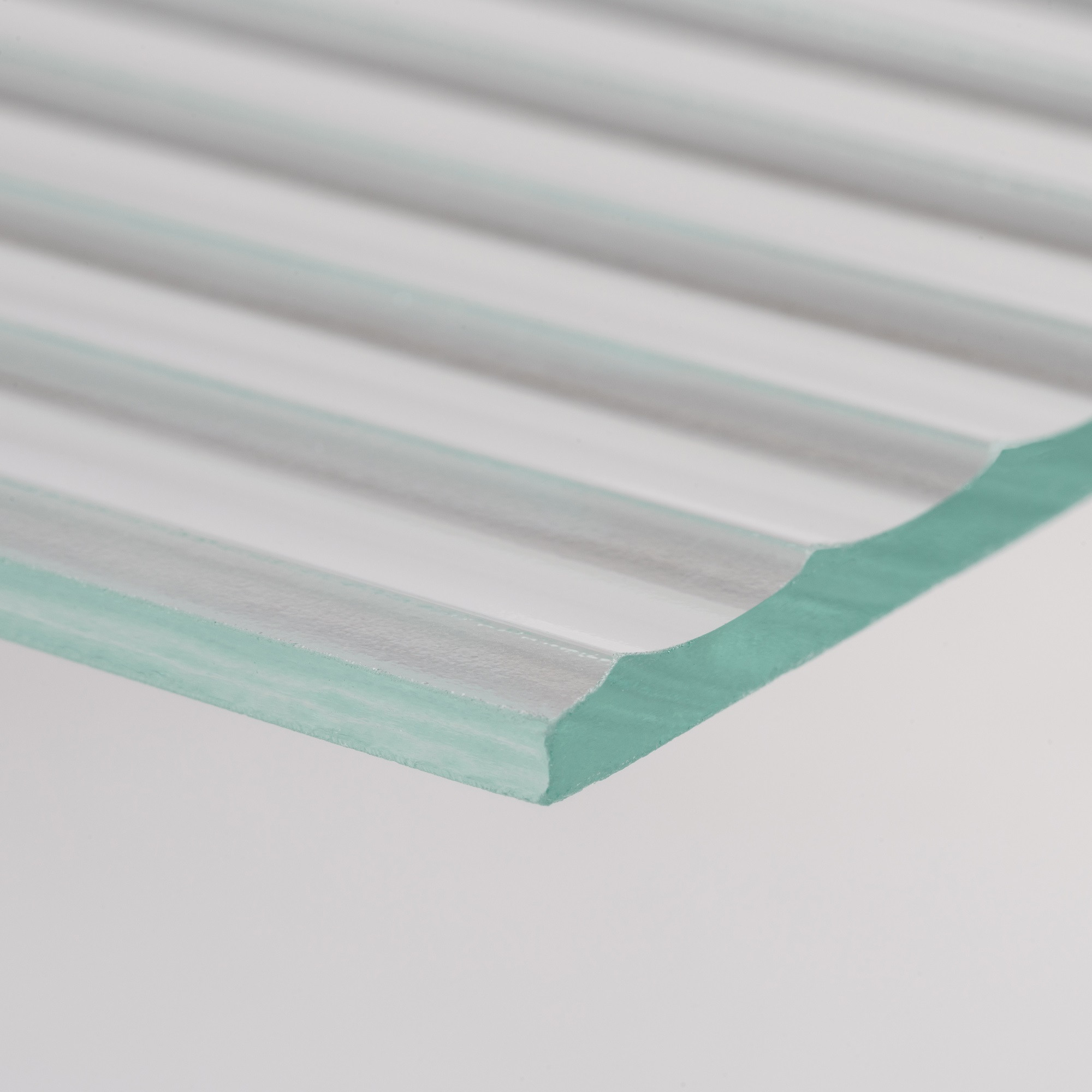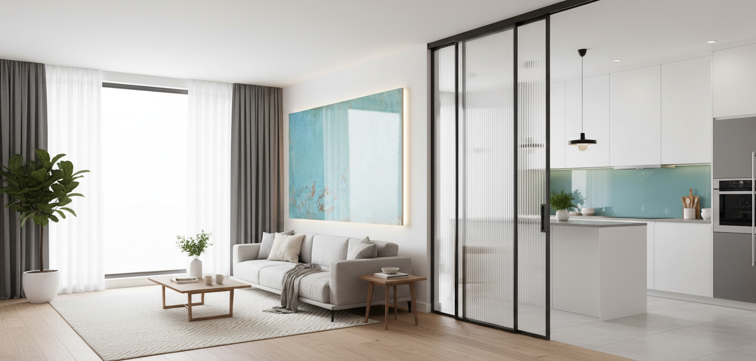 Součástí prostoru je elegantní skleněná příčka s jemným ornamentním vzorem Flutes. Tento prvek vizuálně odděluje obytnou zónu, aniž by vytvářela bariéru, a zachovává průhlednost a vzdušnost celého prostoru. Vertikální pruhy ornamentu přidávají prostoru na jemnosti a sofistikovanosti, vzor vytváří zajímavou působivou hru světla a stínů v průběhu dne.