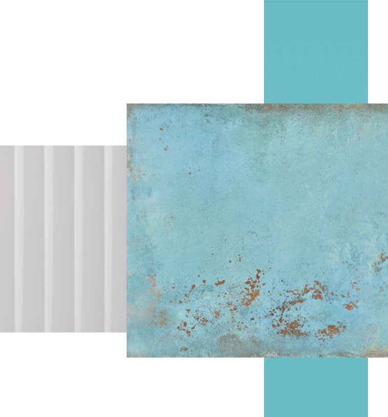 Hlavní hvězda prostoru je bezesporu tyrkysová stěna za televizí, která se stala dominantním prvkem celého obývacího pokoje. Skleněná deska s efektem stěrky Blue Metal z knihovny IZOS Design dodává prostoru hloubku a texturu. Věrně napodobuje ruční štukovou úpravu, včetně jemných nerovností a barevných přechodů. Metoda digitálního tisku byla zvolena záměrně, protože na rozdíl od skutečné stěrky je sklo snadno udržovatelné a časem neztrácí barevnost. Navíc odráží světlo a vytváří v místnosti pocit vzdušnosti.