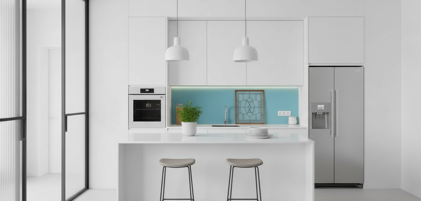 Návrh je skvělým příkladem toho, že lze kombinovat různé skleněné technologie a povrchy, aniž by prostor působil roztříštěně. Naopak, díky promyšlenému barevnému konceptu a propojení tyrkysových odstínů vznikl interiér, který dýchá elegancí, čistotou a moderním stylem.