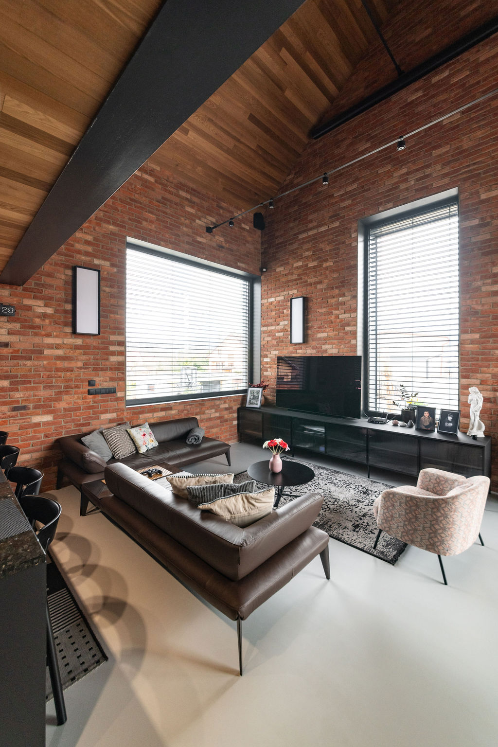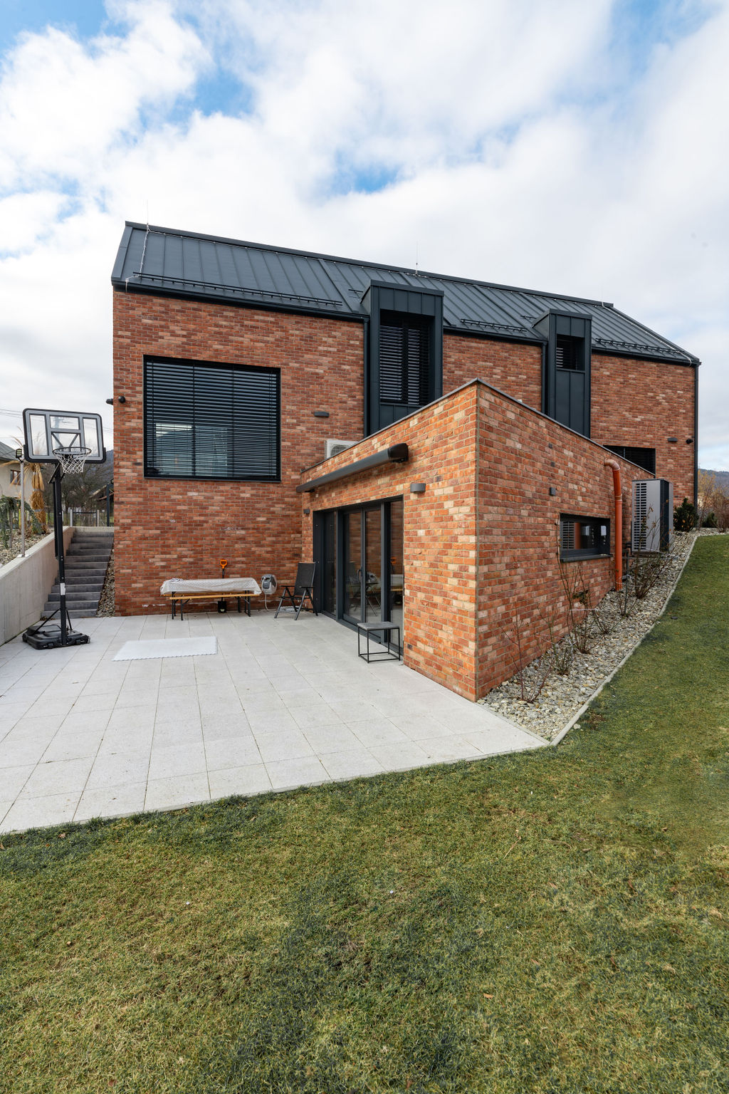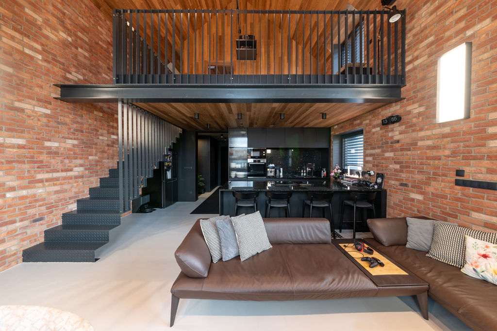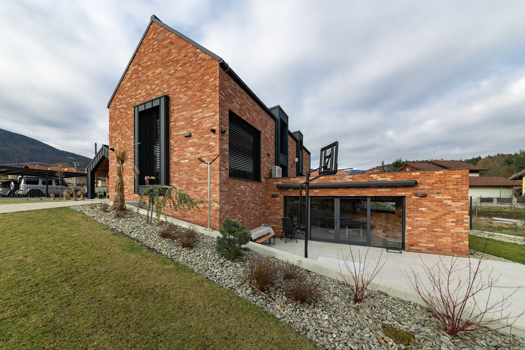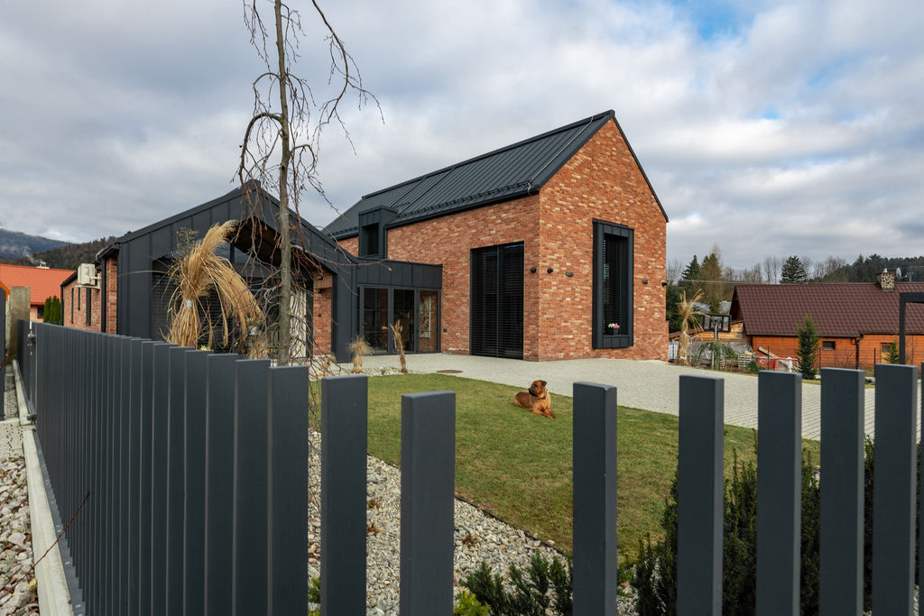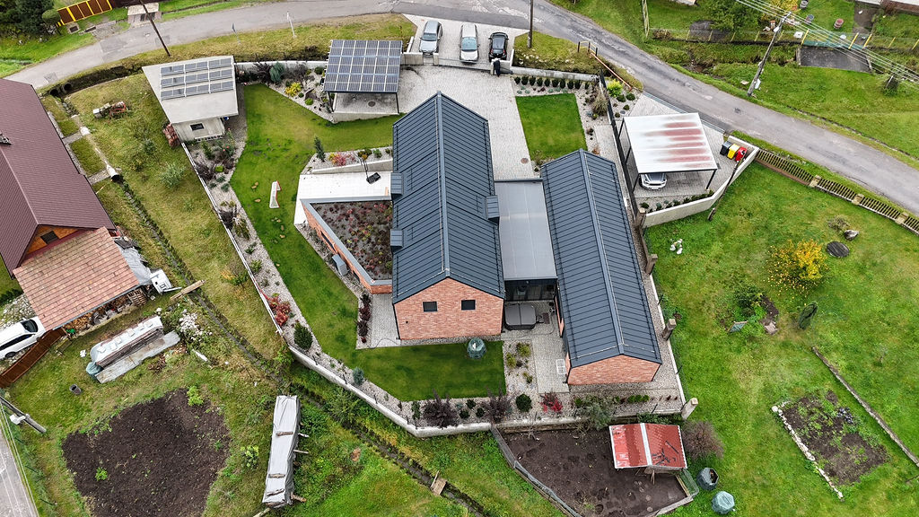 Výsledek tvoří dva paralelně položené tradičně tvarované domy se sedlovými střechami a spojovací částí uprostřed. Větší z nich obývá investor se dvěma syny, menší je pro rodiče. Hlavní křídlo má dvě podlaží, dole je investorův dvoupokojový byt s obývákem, ložnicí, kuchyní a koupelnou. O patro výš leží pokoje synů. „Na druhou stranu člověk potřebuje prostor, proto to mám uvnitř tak vysoké. Nahoře díky tomu vznikl takový balkon. Nejdřív jsem uvažoval, že si tam zřídím kancelář, ale nakonec je z toho kino. Dolů se nám ještě vešla jedna místnost na relaxování, kde máme ping pong.” Rodiče mají v přízemním křídle k dispozici tři pokoje s příslušenstvím.